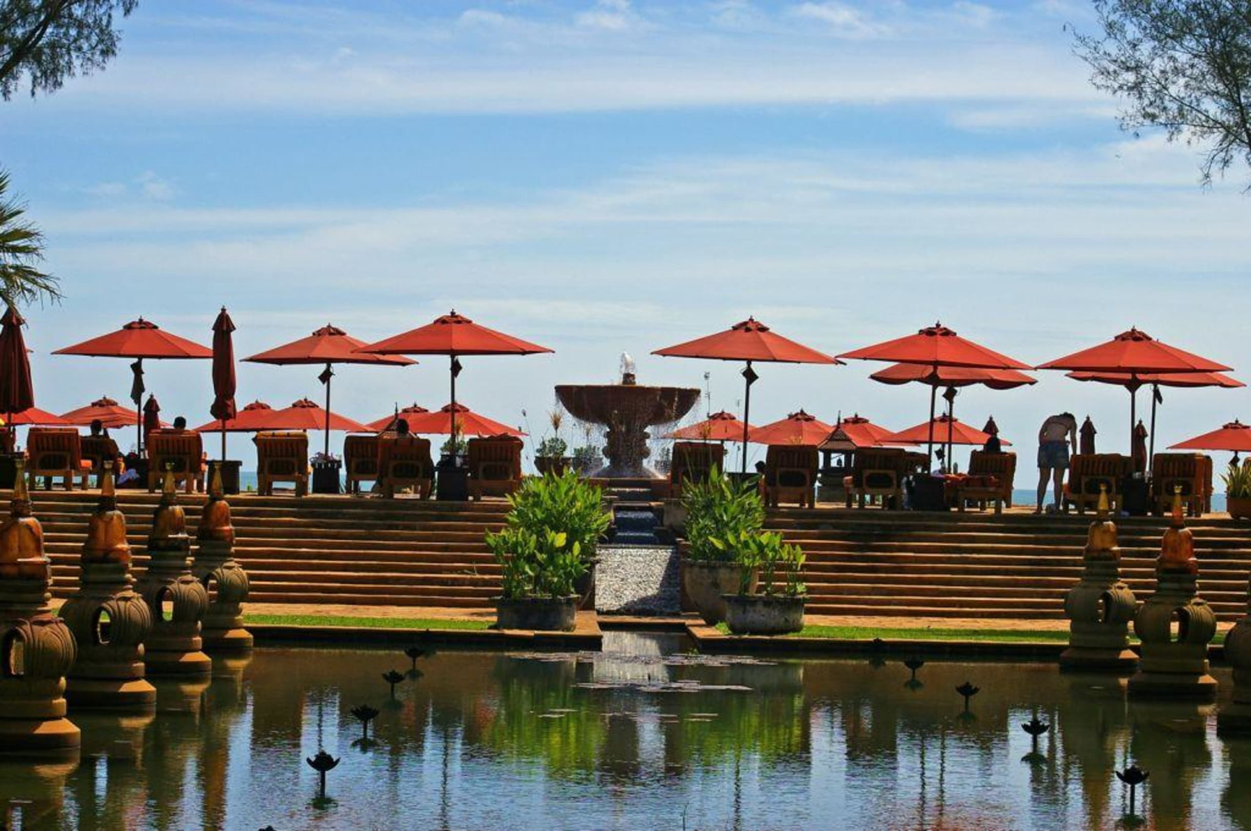 Blick über den Lotus-Pond auf den Liegebereich am Zentral-Pool.