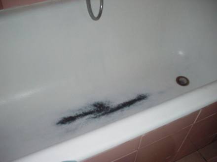 Ein abgenutzter Badeteppich klebte noch unten in der Wanne.