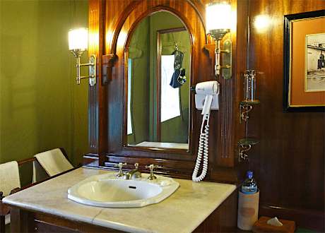 Zimmer und Badezimmer sind im englischen Stil des vergangenen Jahrhunderts eingerichtet. Neben Himmelbett und Teppichen gefiel uns dieser Waschtisch aus Marmor.