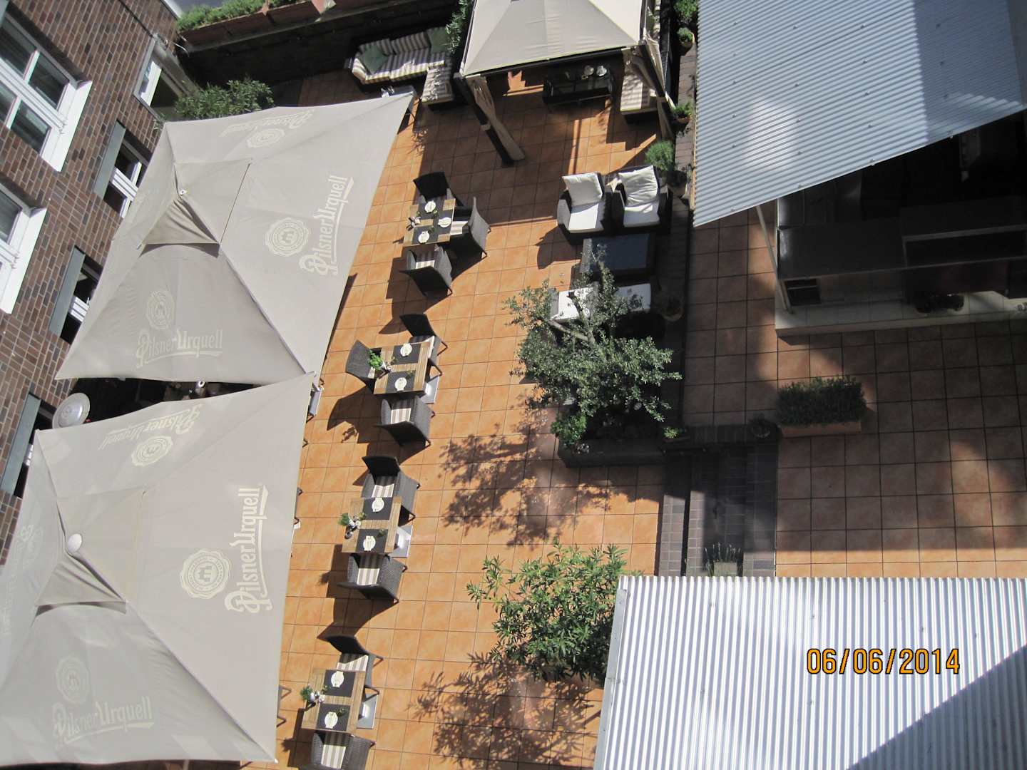 Zimmer mir Blick zum Innenhof (Terrasse mit Bar)