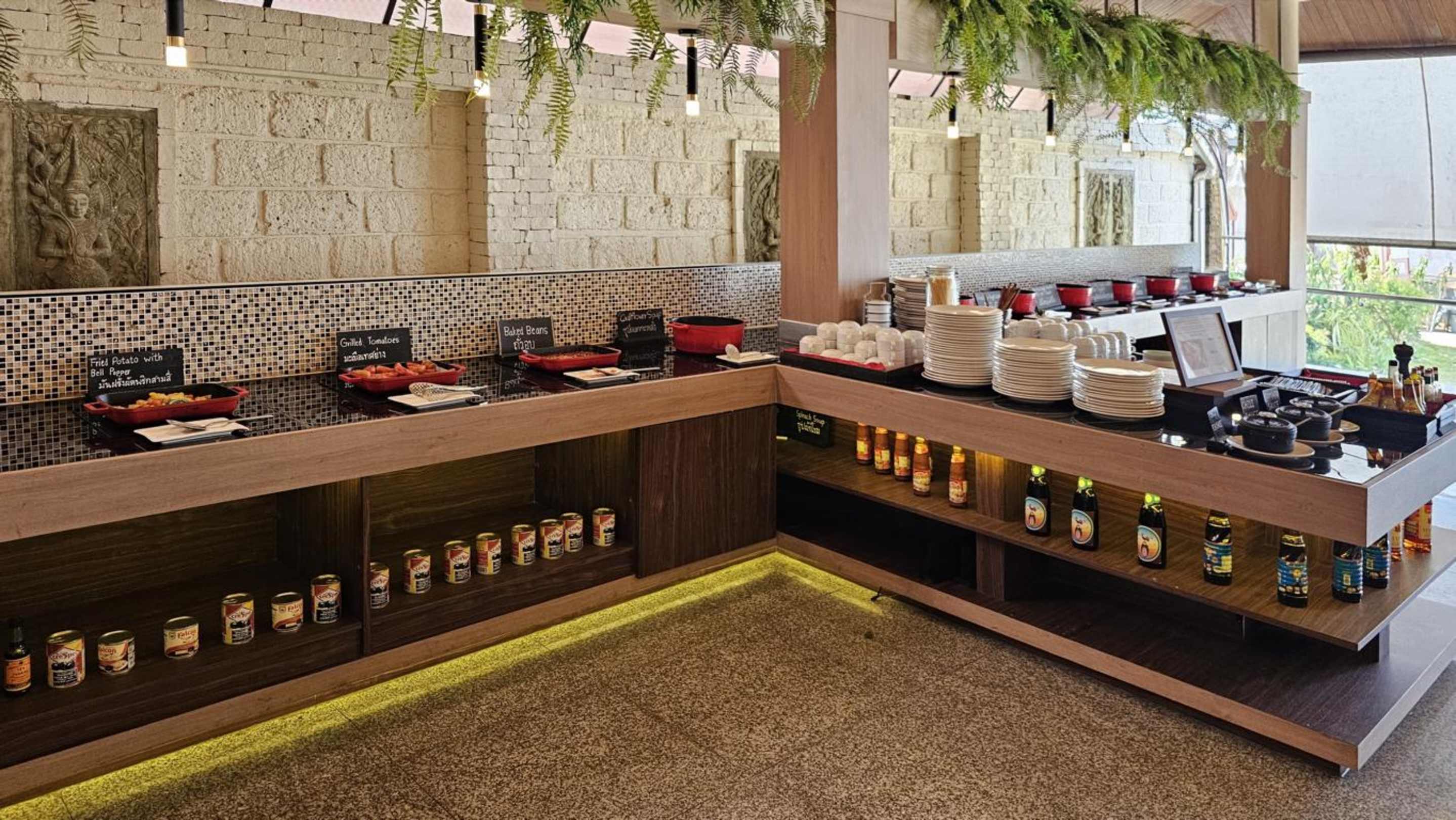 hier gibt es die warmen Speisen; Eisentöpfe stehen auf Induktionsflächen