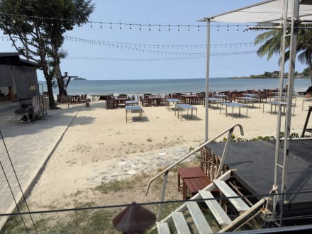 Der offene Frühstückssaal mit Blick zum Strand und der bunten Tischvielfalt Aber die Bühne Top't alles