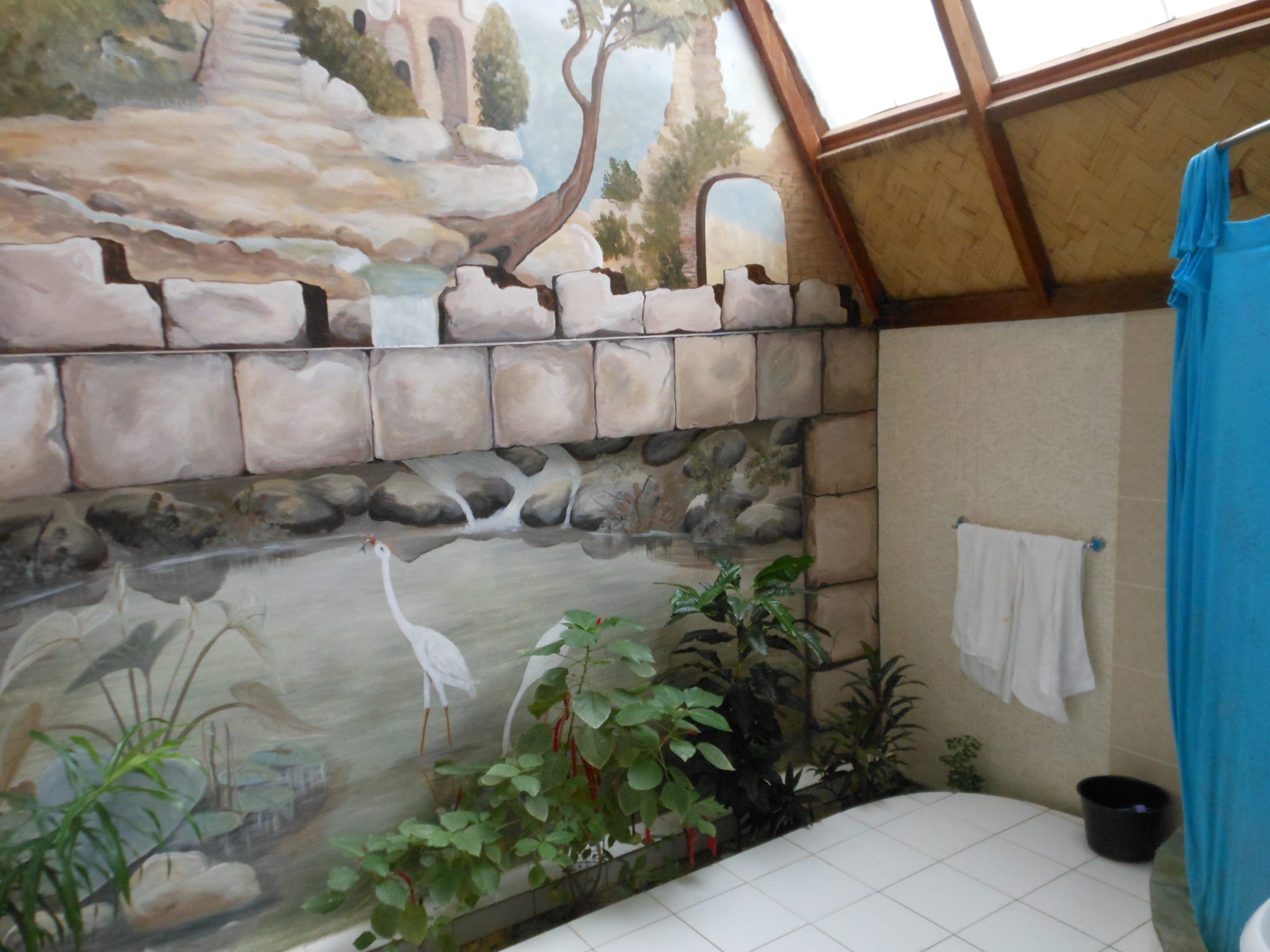 Sehr helles, grosses Badezimmer mit Pflanzen.