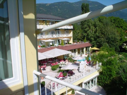 Blick vom Zimmer auf die Hotelterrasse und den Außenpool.