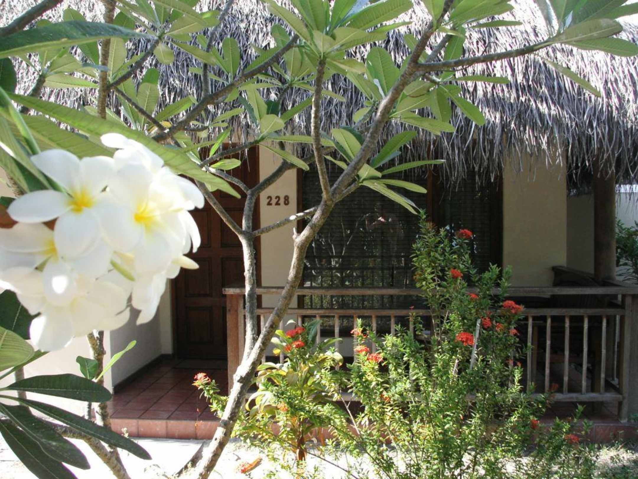 StrandbungalowDie Strandbungalows sind alle auf der schöneren Lagunenseite. Zum Strand sind es meist nur ein paar Meter. Bei Nr. 228 hat uns allerdings der recht nahe und daher sehr laute Stromgenerator gestört, so dass wir nach einer Woche in einen Bungalow, der vom Wasser aus gesehen rechts vom Restaurant liegt (201 - 215), umgezogen sind.