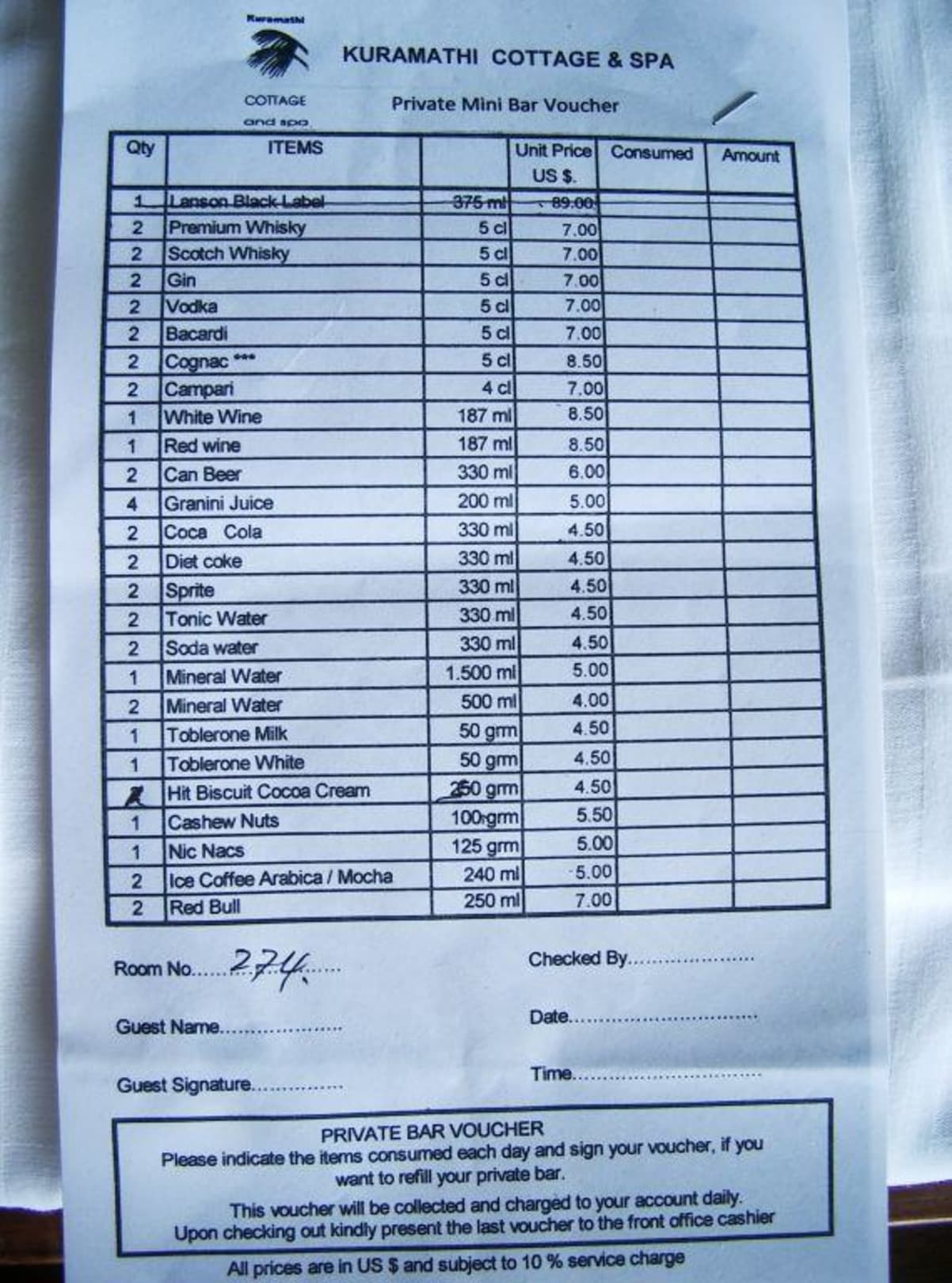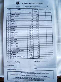 Preisliste Minibar1,5 Liter Flasche Wasser kostet in der Minibar 5,00 $ plus 0,50 $ Servicecharge. In der Bar "nur" 4,40 $.