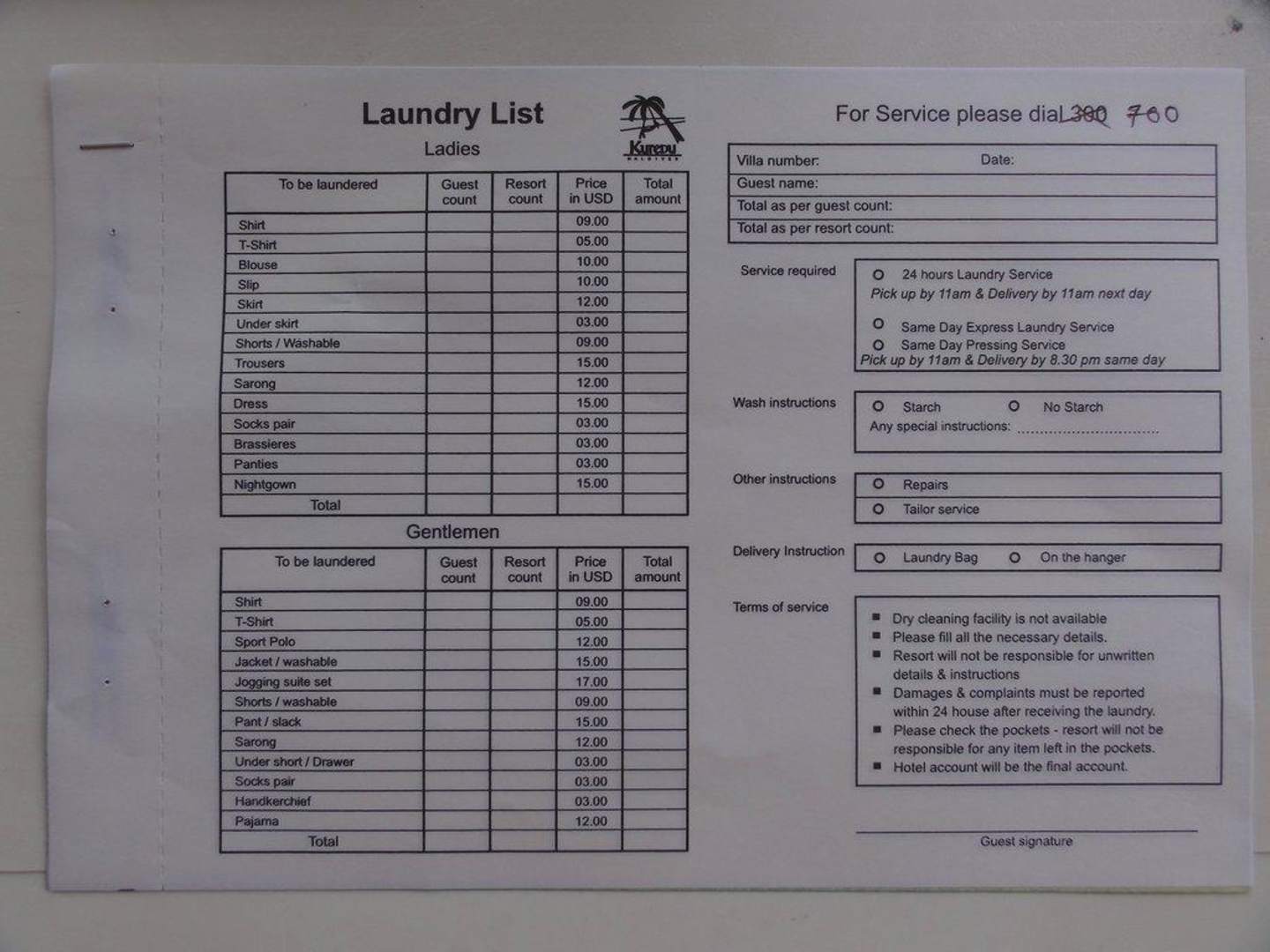 Laundry List Kuredu. Preisliste Reinigungsservice für Anziehsachen