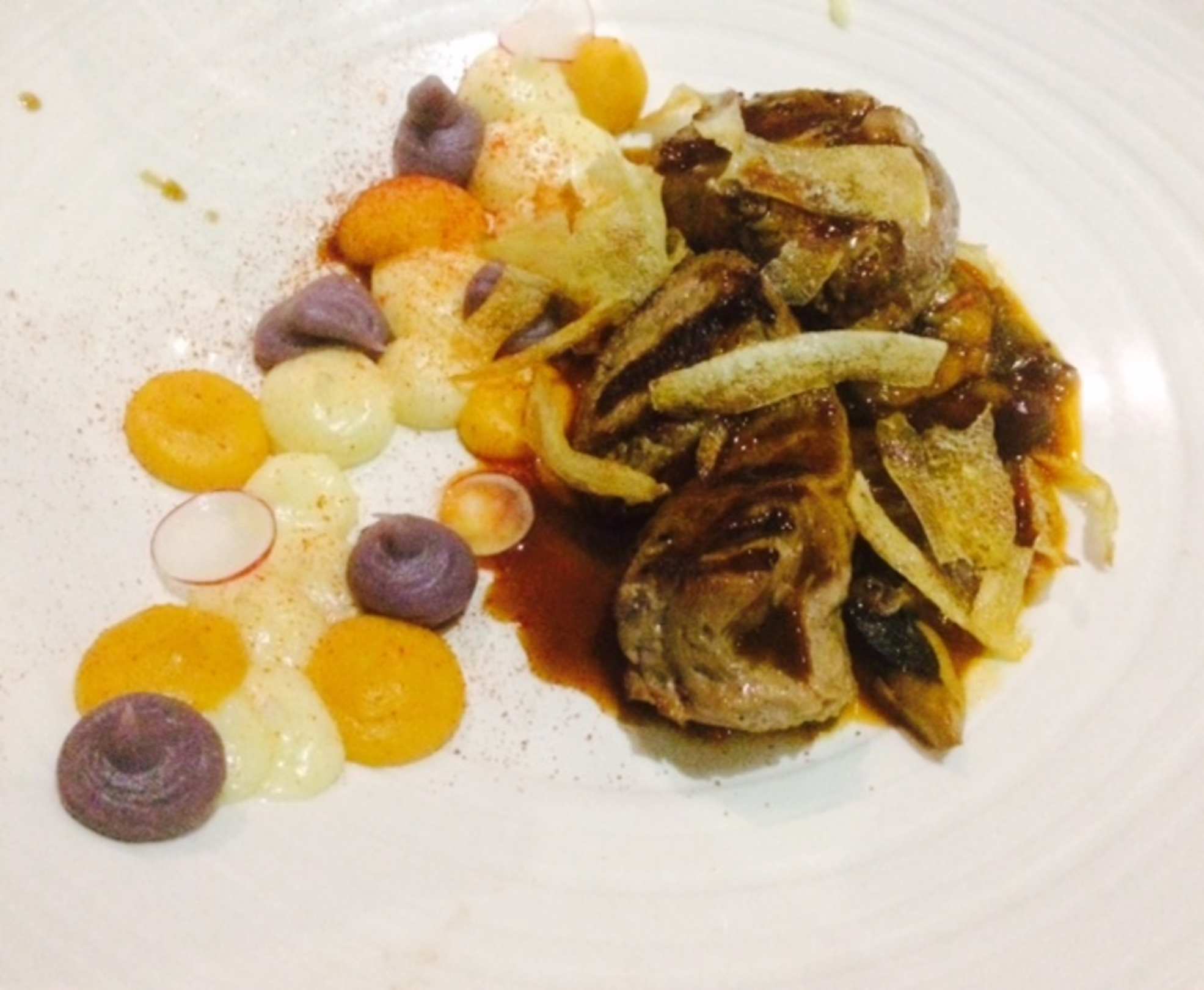 RestaurantHauptgang im französischen Restaurant L'Etoile: Kalbsfilet mit Kartoffel- und Kürbisschaum, frittierten Kartoffelscheiben und Pilzen.