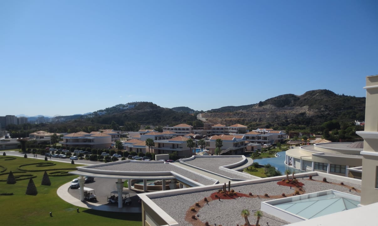 Siedlung mit den 2 stöckigen Gebäuden dort wo die Zimmer sich befinden. Die Zimmer mit Terrasse haben den Pool nur 10 Schritte entfernt direkt davor. Im Hauphaus sind die Zimmer 3 stöckig .