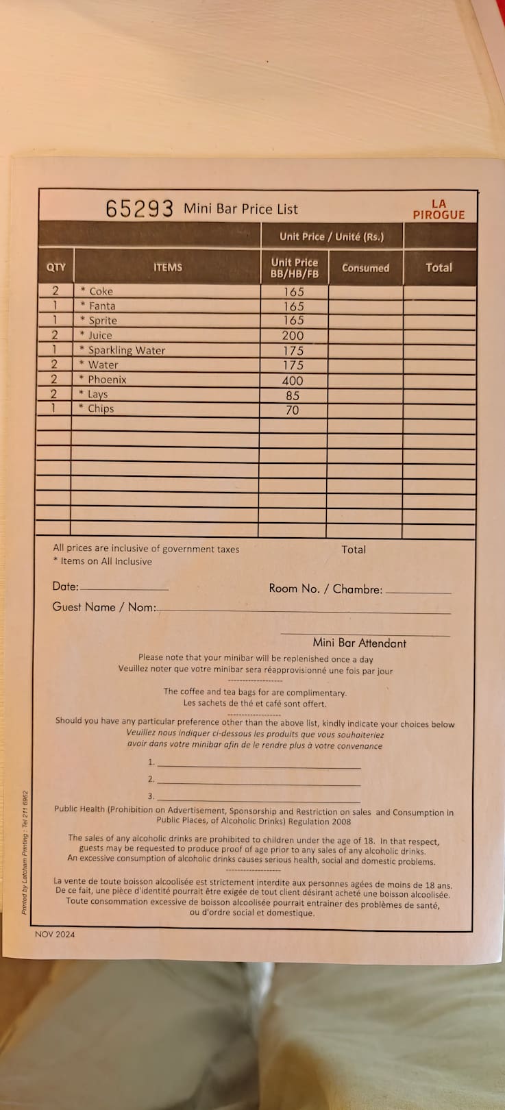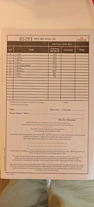 Minibarpreise bei Halbpension. Im AI ist alles kostenlos.