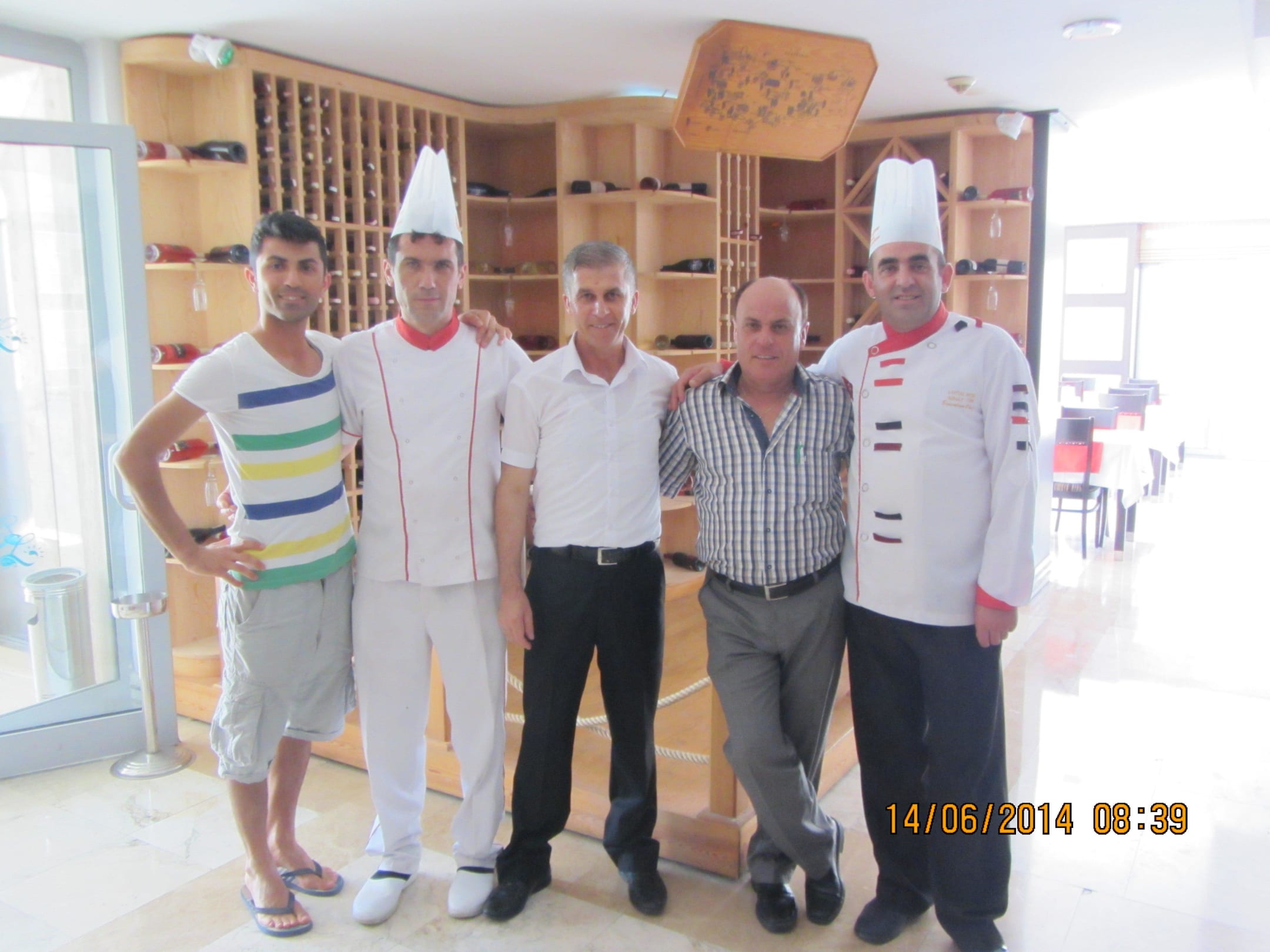 Personal Küche- KellnerKüche und Bar vereint, im Hintergrund großes Wein-regal mit sehr guten Weinen