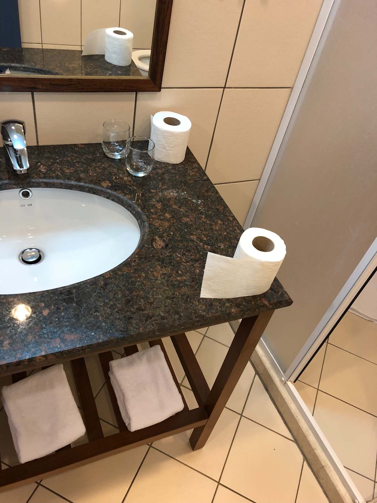 Toiletten Papier liegt auf dem Waschbecken