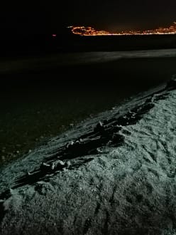 Vom Strand aus sieht man das leuchtende Alanya