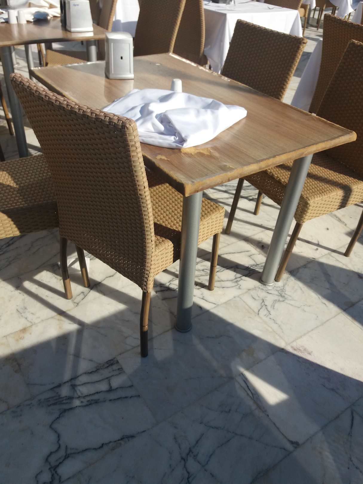Aufgequollene Tische im Außenbereich