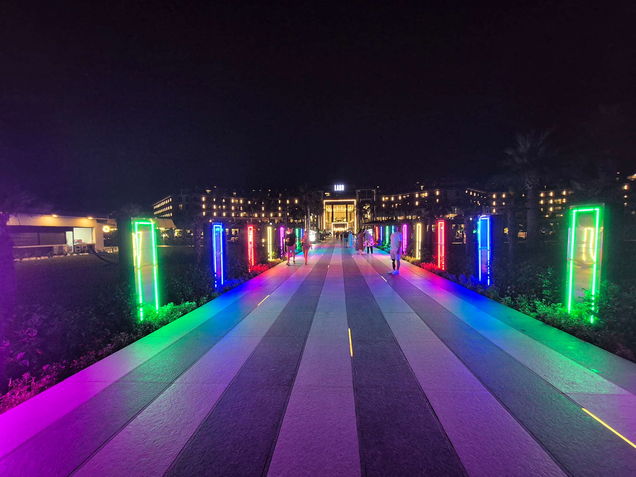 Der beleuchtete Weg vom Strand zum Hotel
