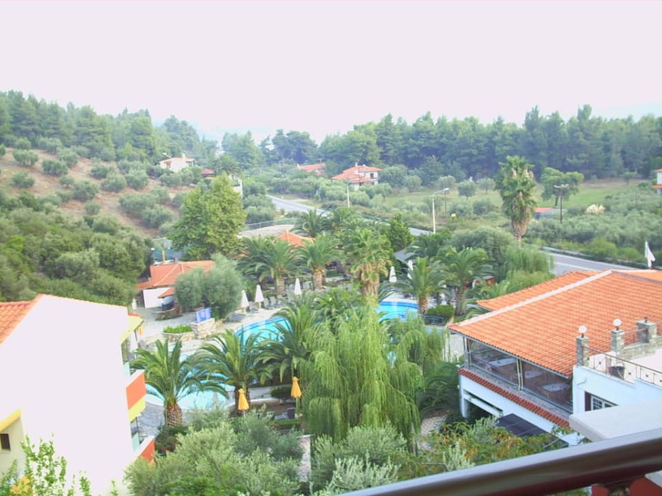 rechts ist der Speisesaal und davor der Pool Ausblick aus einem Zimmer