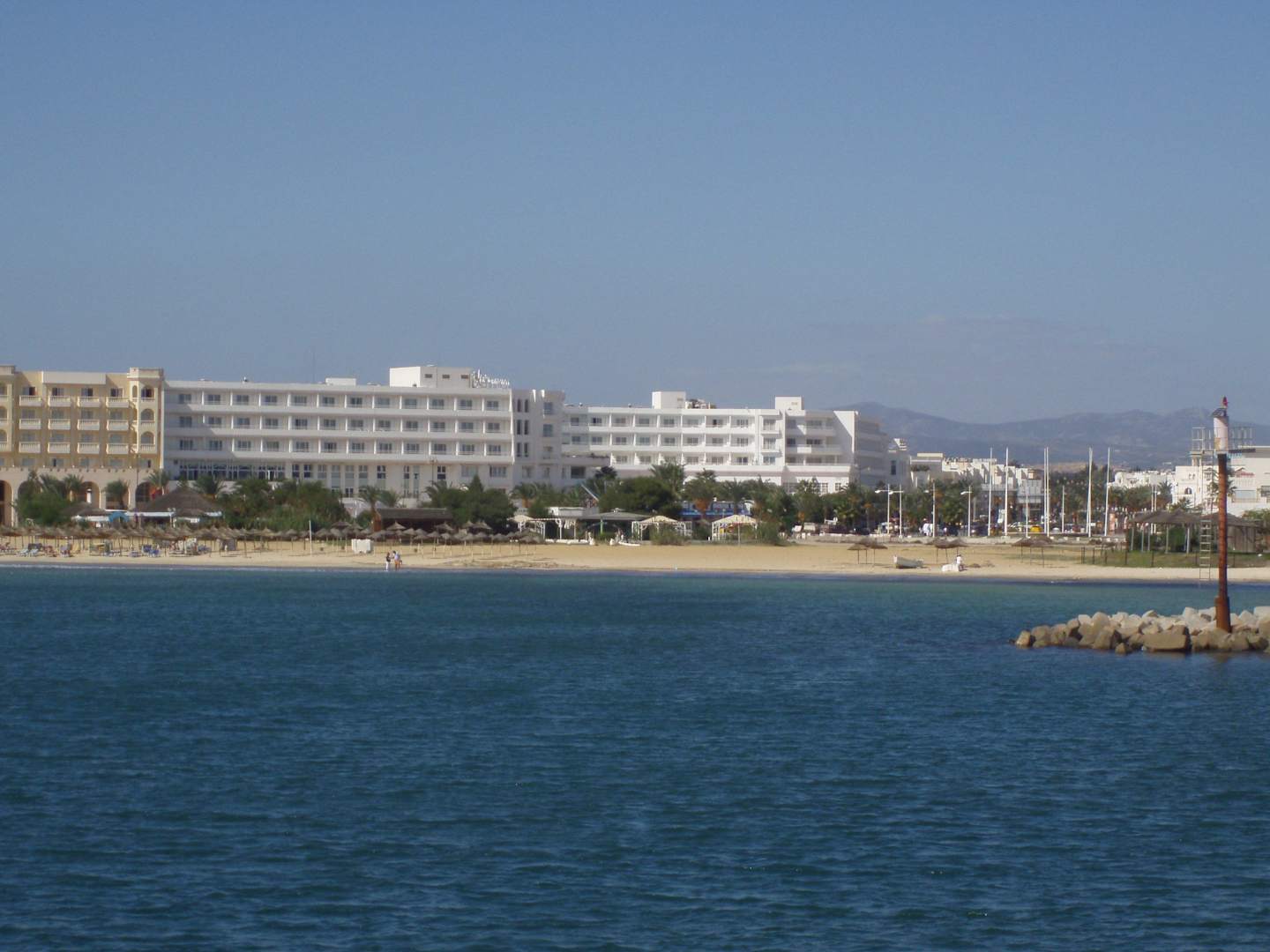 Das Hotel Laico (in weiß, an der Ecke gelegen) inkl. Strand. Die Aufnahme wurde vom Schiff aus gemacht, das direkt aus dem Hafen kommt. Leider auch in direkter Nähe zum Hotel-Strand