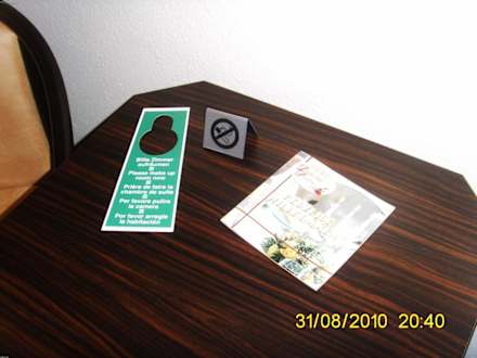 Landgasthof Struckum, Zimmer 5; das Infoblatt "Herzlich Willkommen" und der "Bitte nicht stören"-Türhänger liegen auf dem Tisch im Zimmer