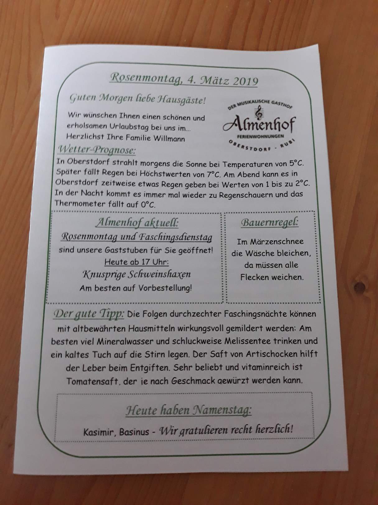 4-Seitiges Almenhof - Tagesblatt