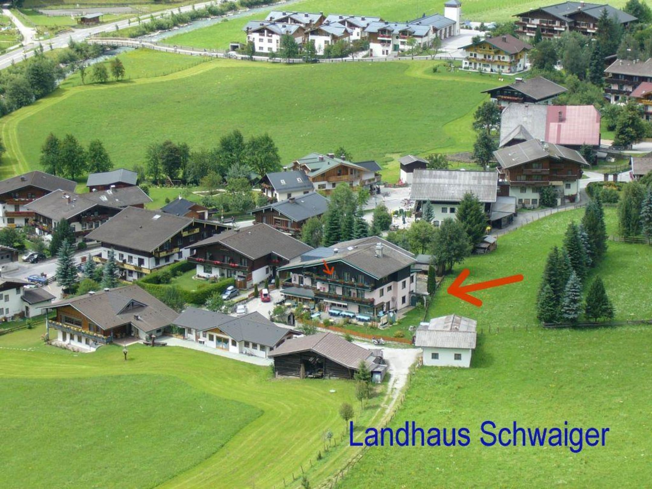 Das Landhaus Schwaiger vom Berghang (Wanderweg Poseralm) fotografiert.