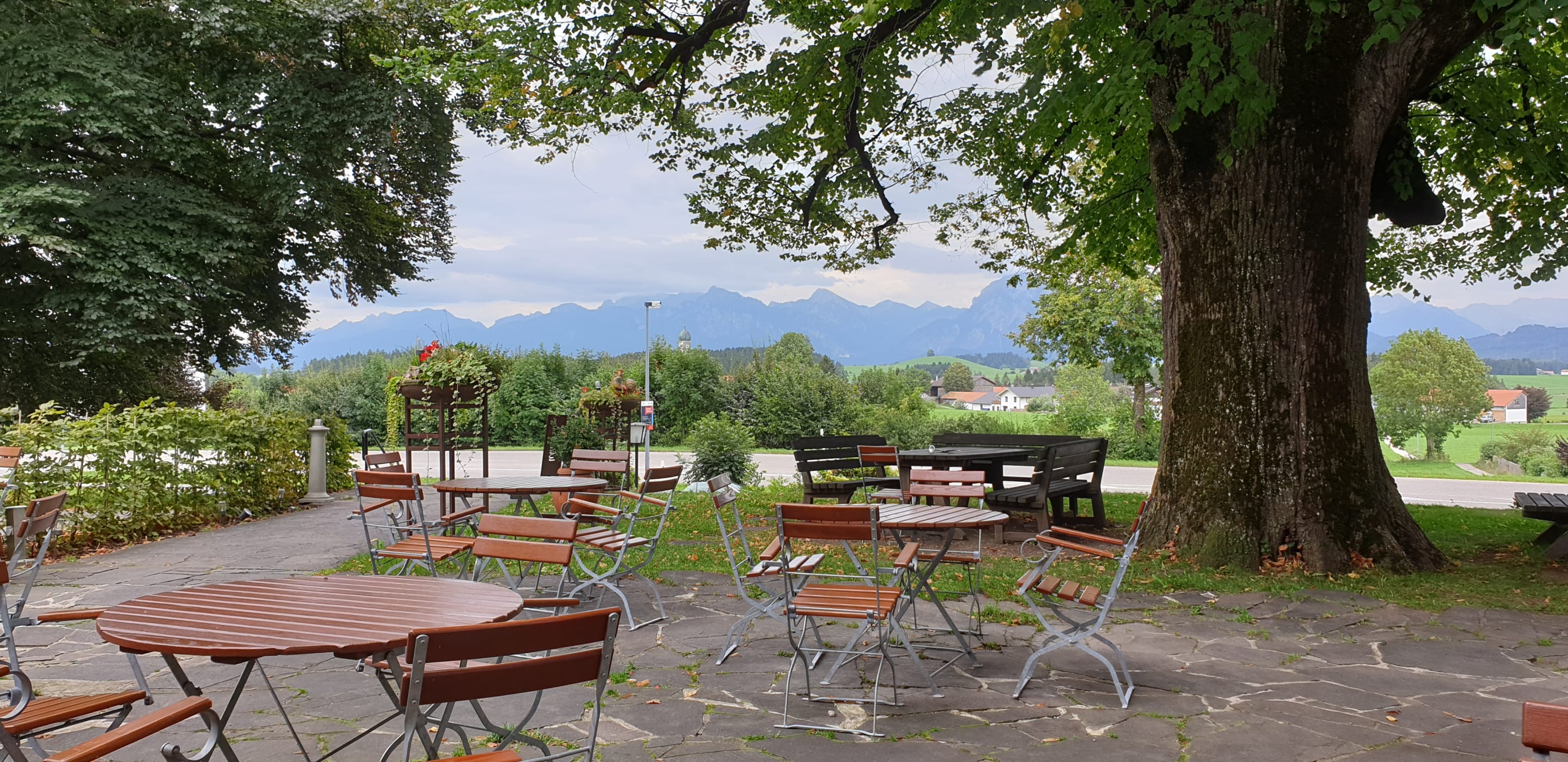 Blick vom Biergarten aus auf die Alpen.