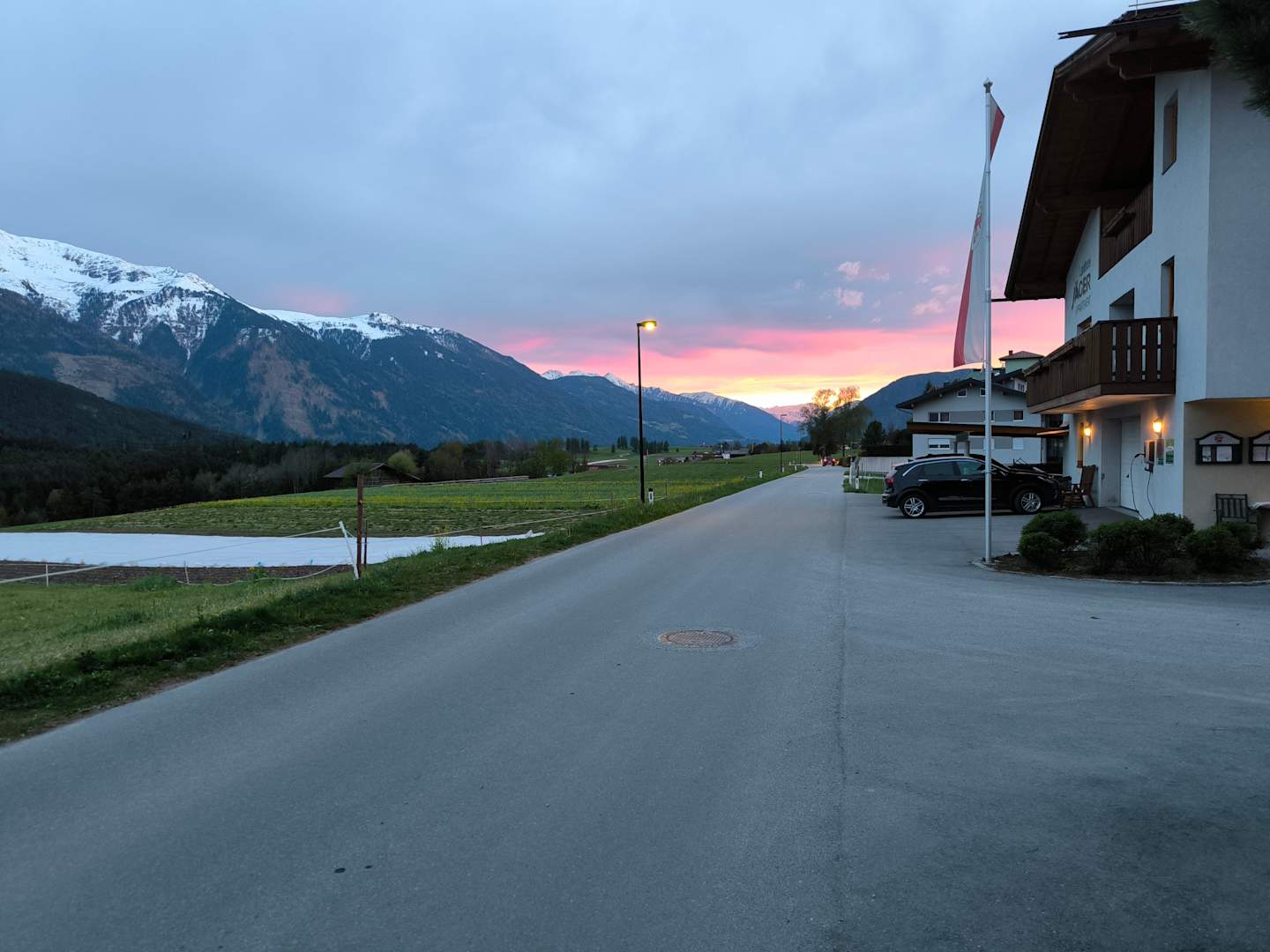 Straße vor dem Hotel am Abend.