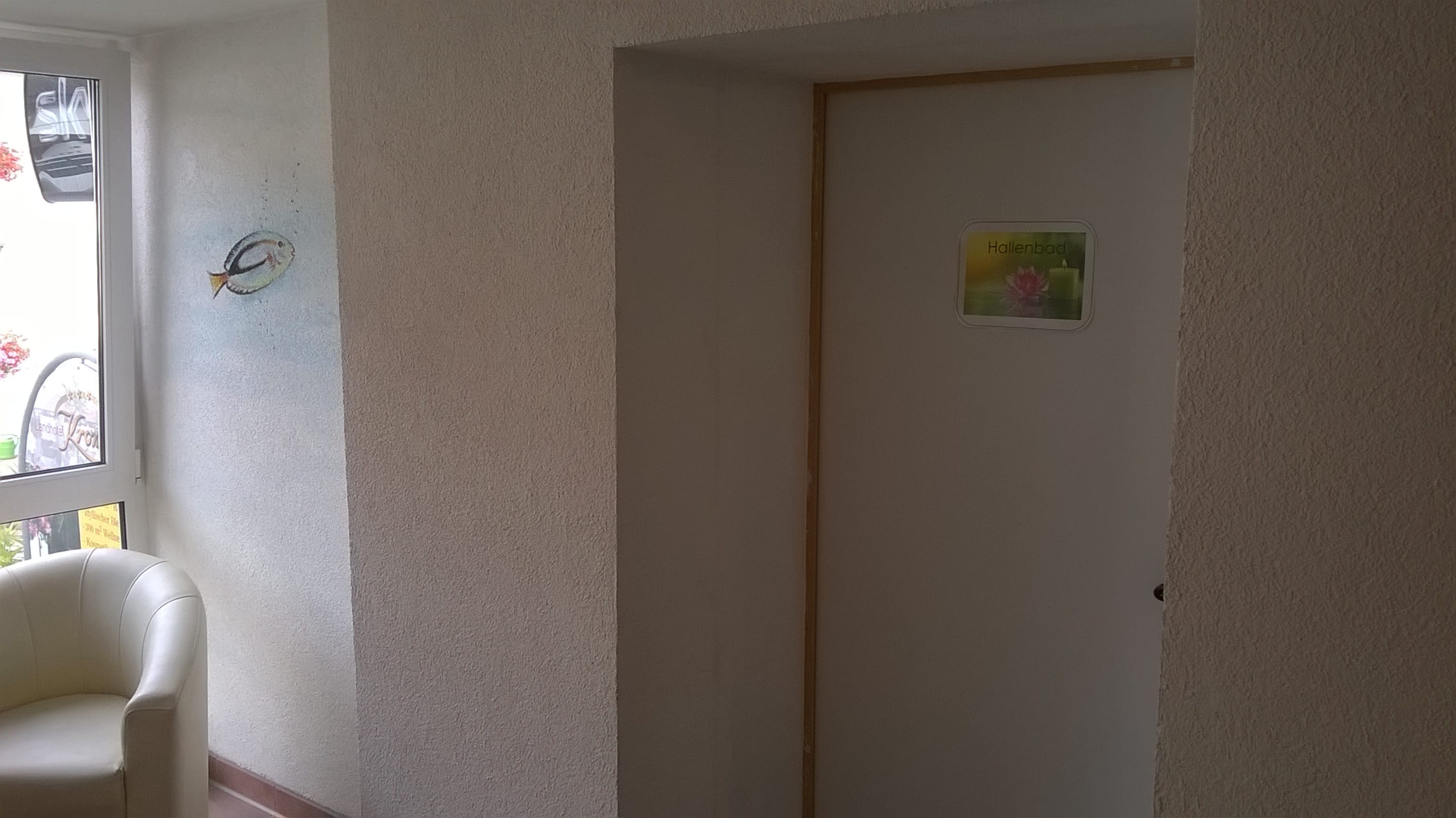 Zugang zum Hallenbad, Vorsicht: Man steht sofort auf kleiner Treppe am Wasser!