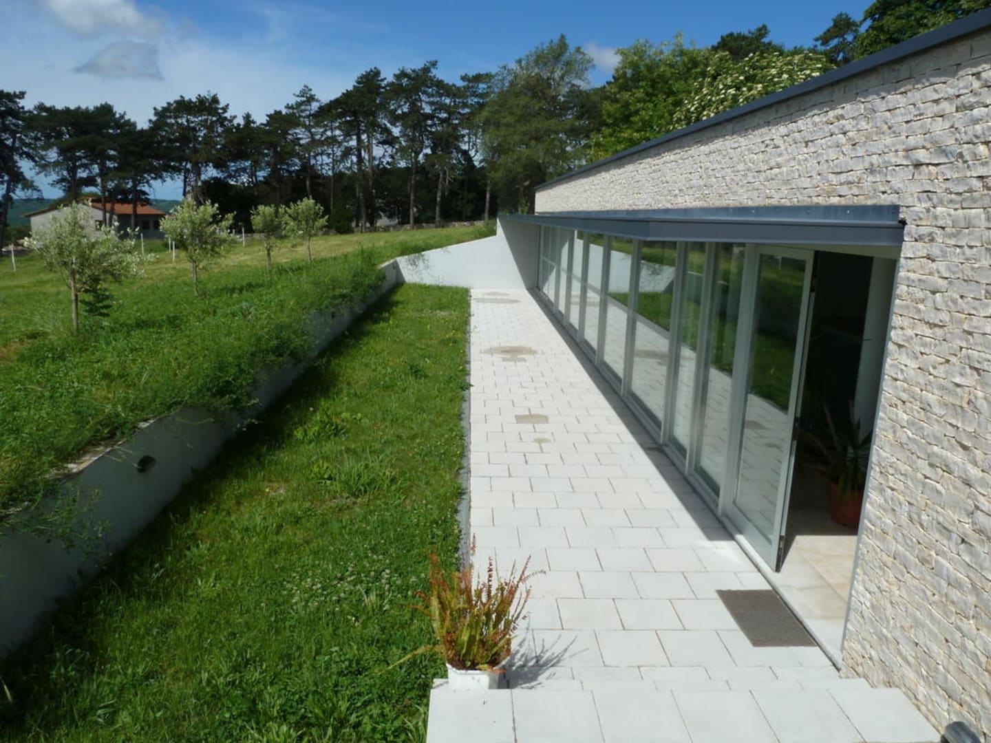 Aussenbereich und Eingang der PoolanlageAuf der anderen Seite findet man den Eingang zur Pool-Anlage (bzw. muss man sich zeigen lassen, von allein findet man es nicht). Links tarnt eine kleine Mauer und junge Bäume die Poolanlage vom Blick vom Dorf aus.