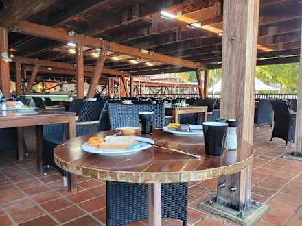 So sehen die Tische aus, wenn 200 hungrige Sportler weg sind. Abräumen dauert 1-2 Stunden
