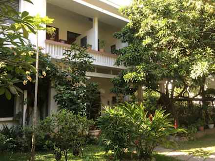 Hotel Außenansicht, links der Eingang, im Hintergrund Teile des Gartens.