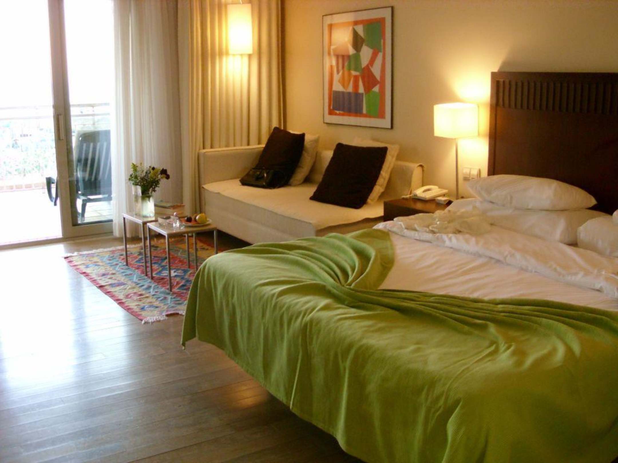 Der Blick übers Bett und Sofa in Richtung Terasse und Meerblick.