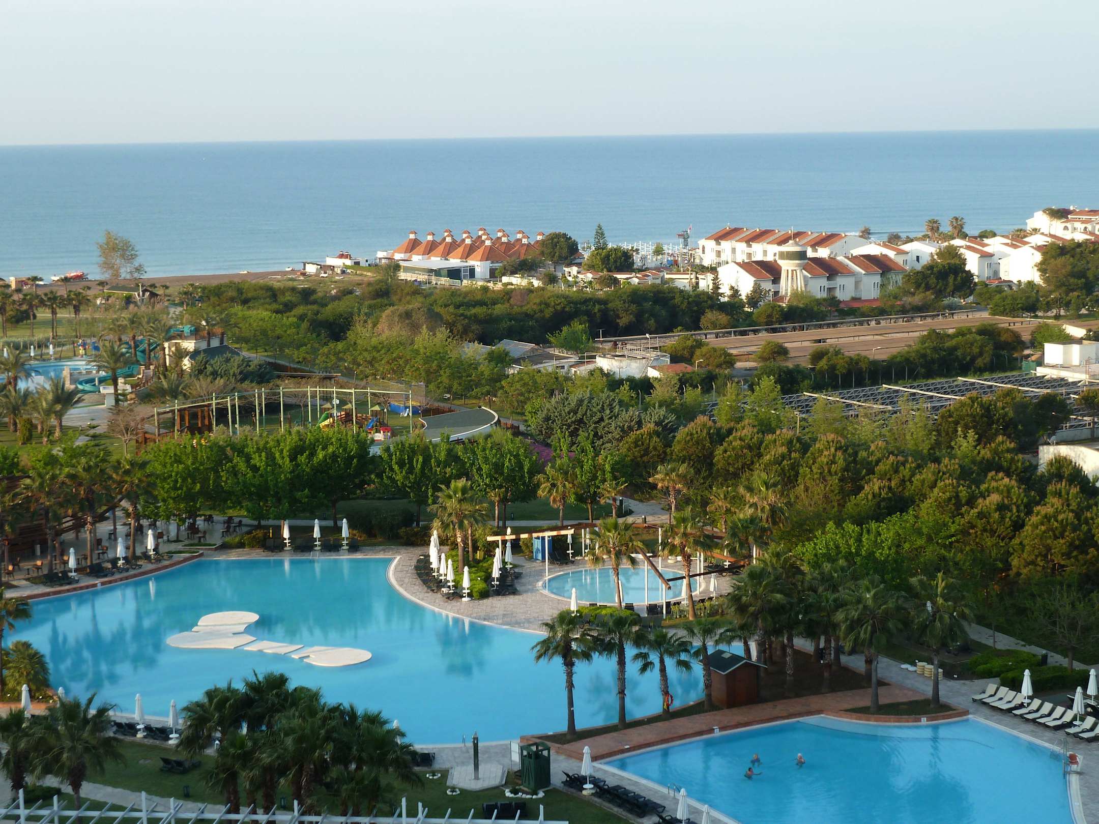 Blick vom Balkon über den Pool zum Meer