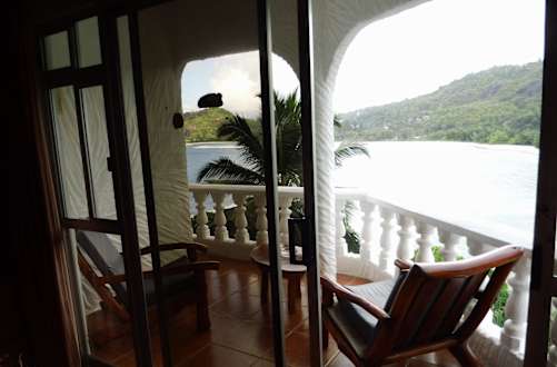 kleiner, mit Naturmöbeln ausgestatteter Balkon mit Übergang zum Nebenbalkon/zimmer