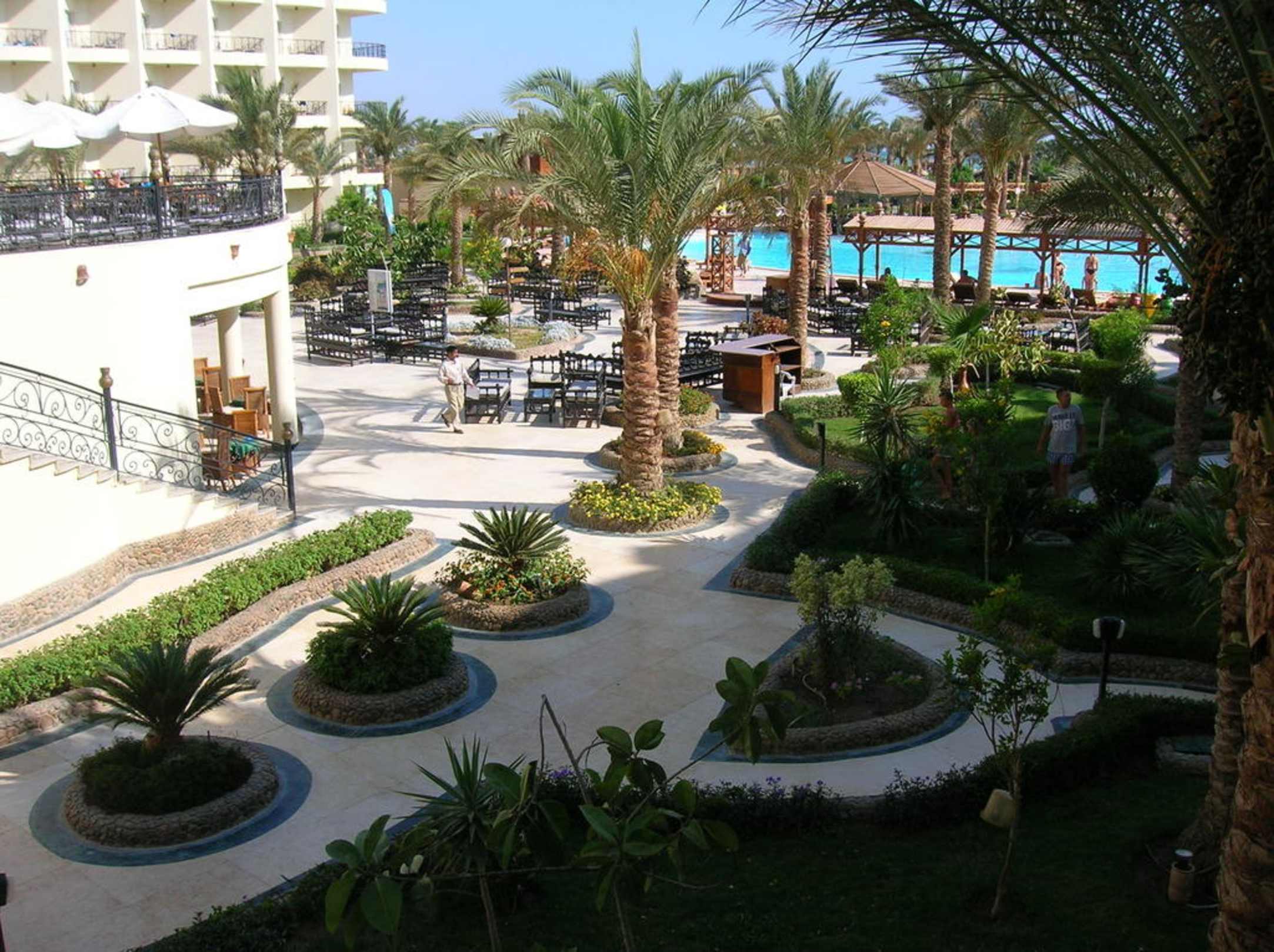 Widok na ogród pomiędzy hotelem a basenami