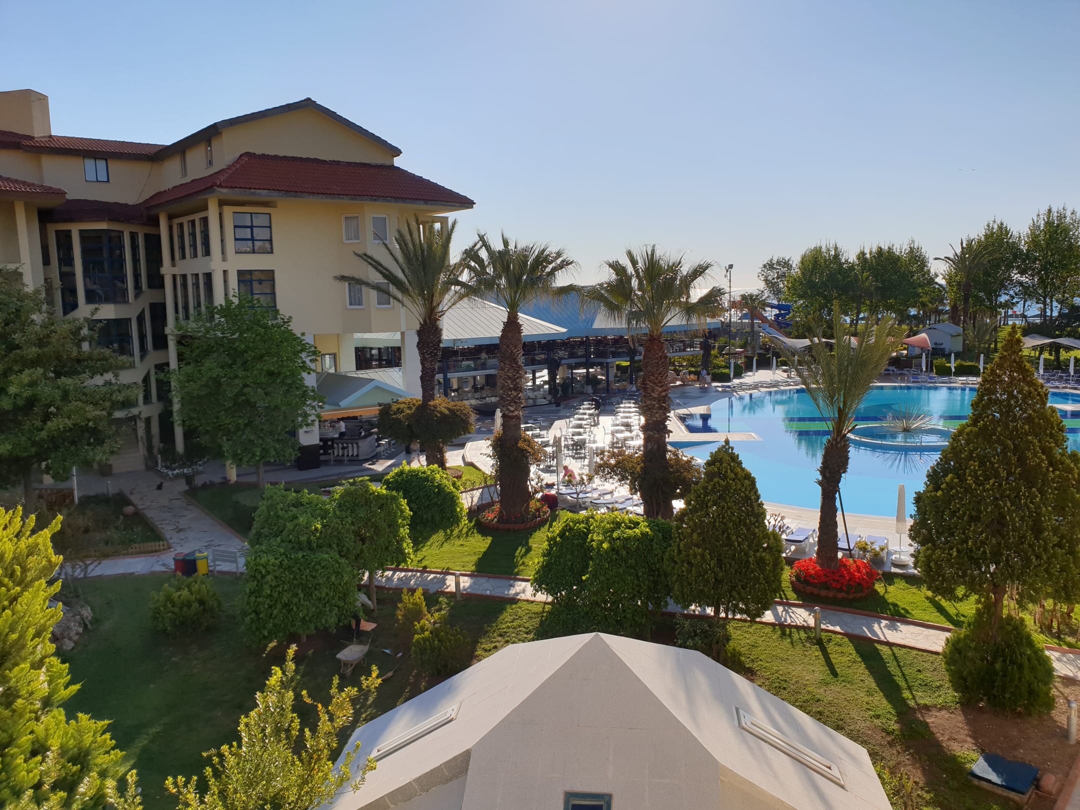 Zimmer 2233 gegenüber liegt der Essensaal, mit Blick auf Pool und Meer, seitlich