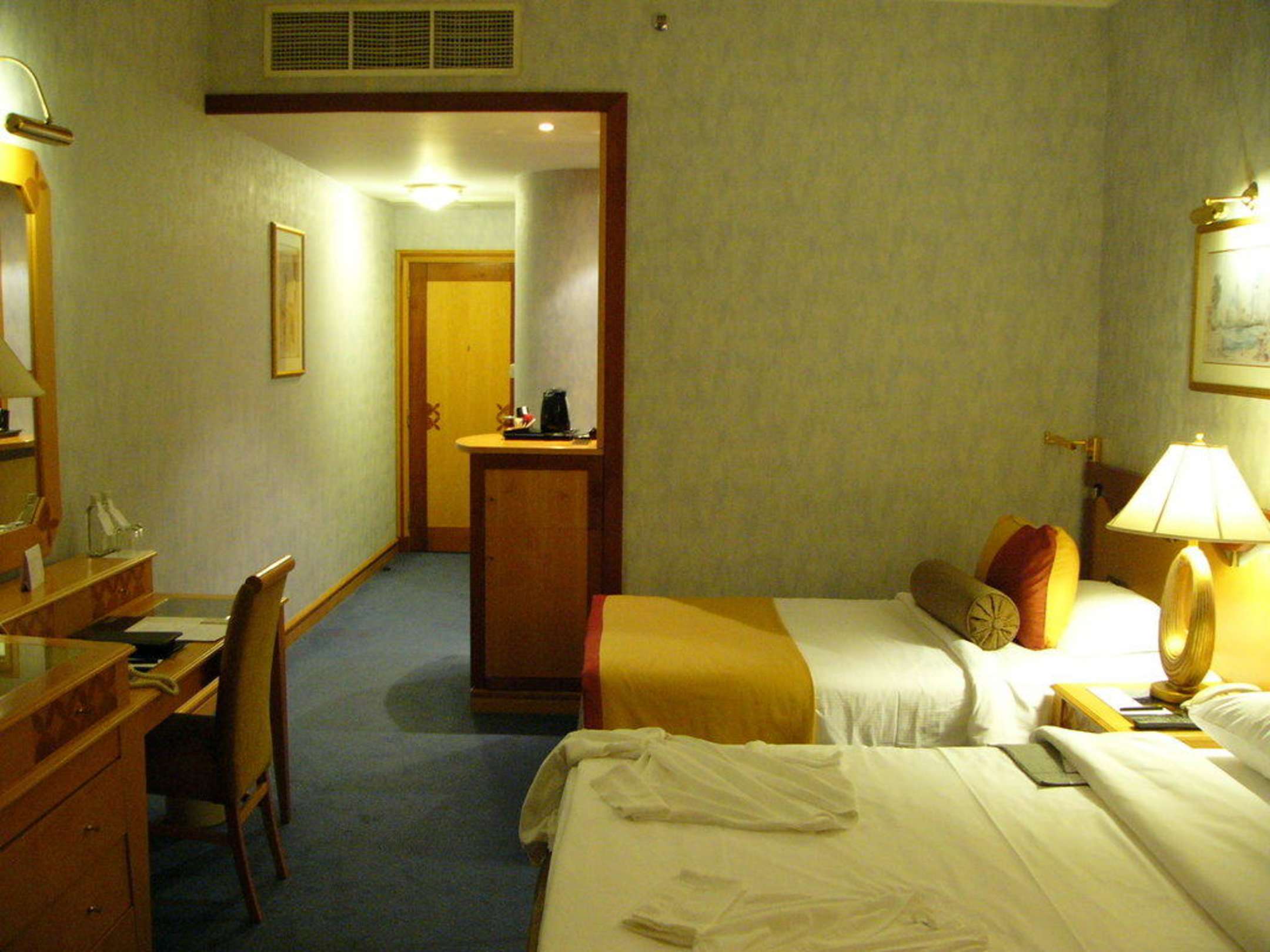 Des Weiteren vorhanden: Safe, Minibar, Bügelbrett, Fernseher (ca. 55cm Bildschirm, Nokia) mit DVD-Player, Haartrockner und Klimaanlage.