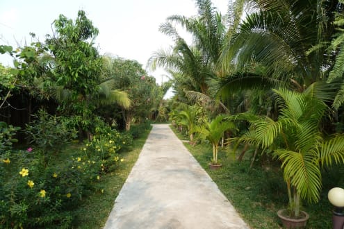 Wege innerhalb der Hotelanlage mit viel Bewuchs.