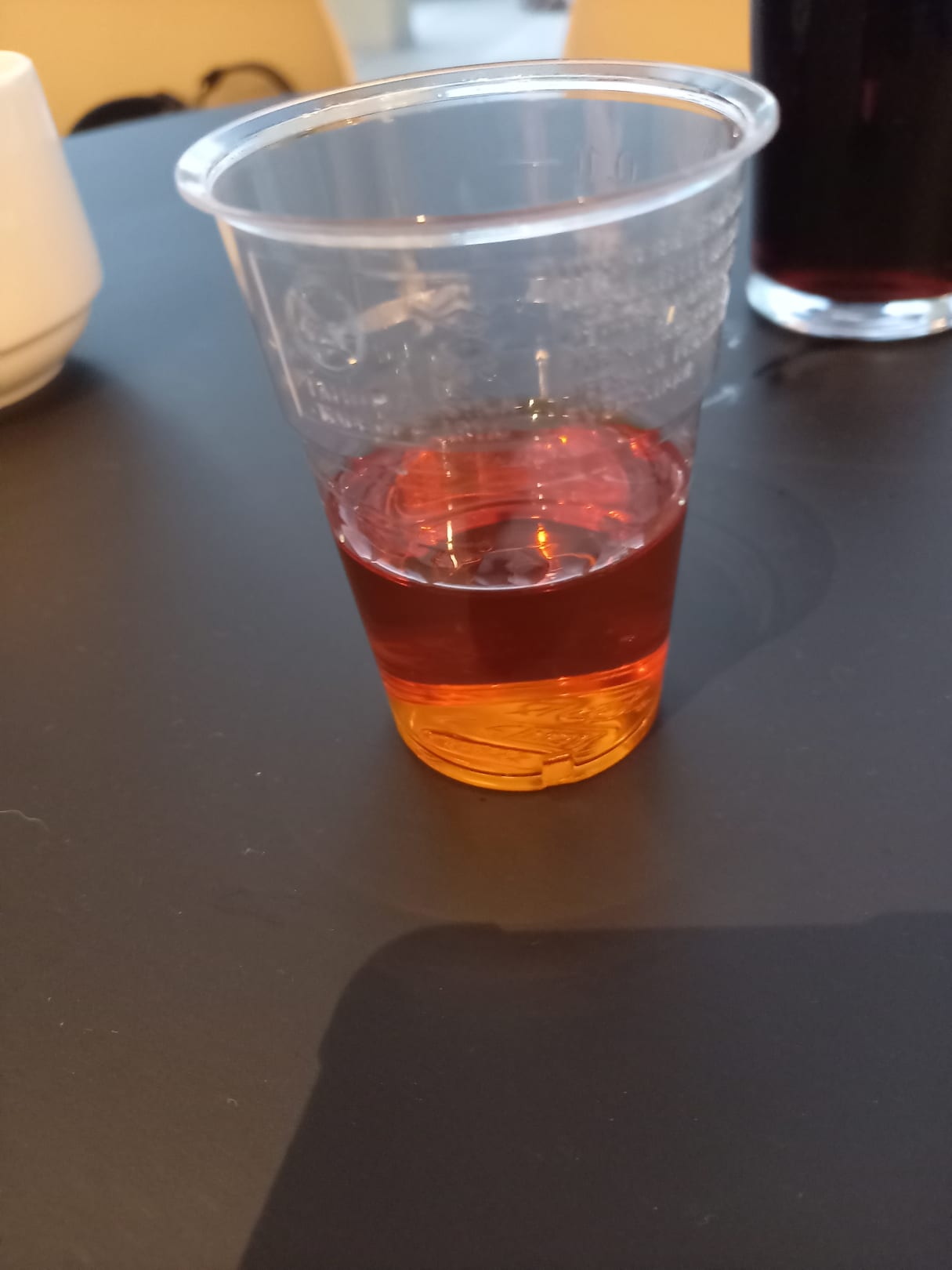 Überall im Hotel , außer im Speisesaal,sind im Jahr 2022 nur Plastik oder Pappbecher verfügbar. Hier ein AllInclusiv Amaretto. Das Angebot an Getränken war sehr enttäuschend und übersichtlich