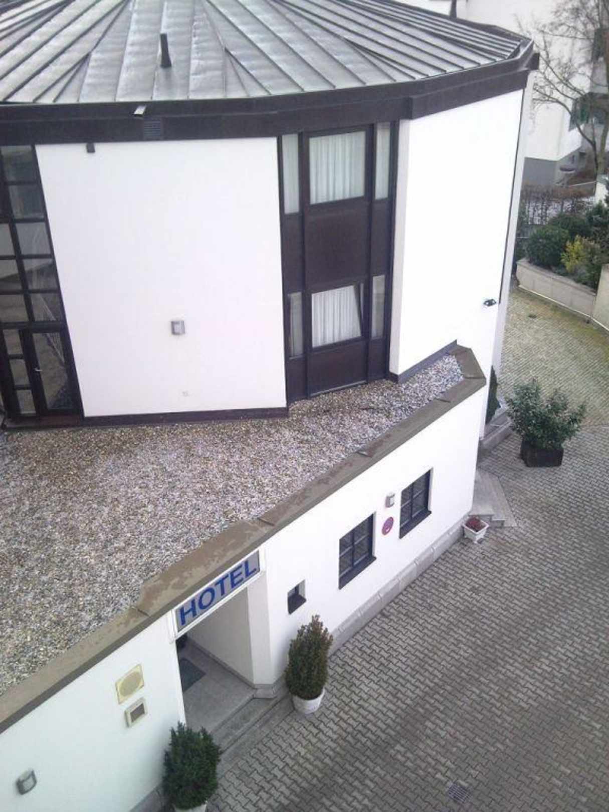 Rückseite des Hotels mit dem neuen Anbau und Eingang von der Hofseite aus.
