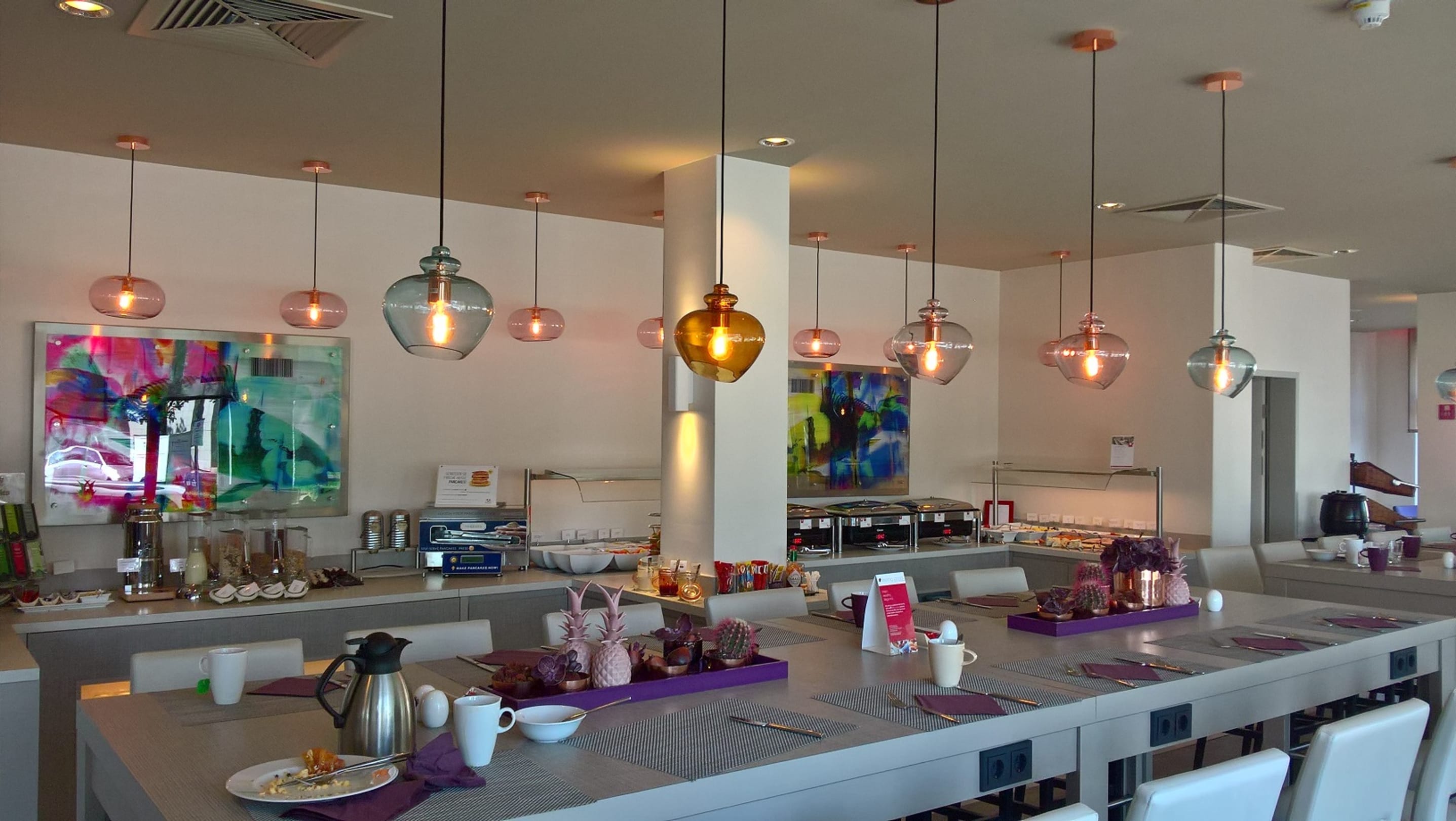 Blick ins Restaurant (vorne die hohen Esstische, hinten ein Teil des Buffets)