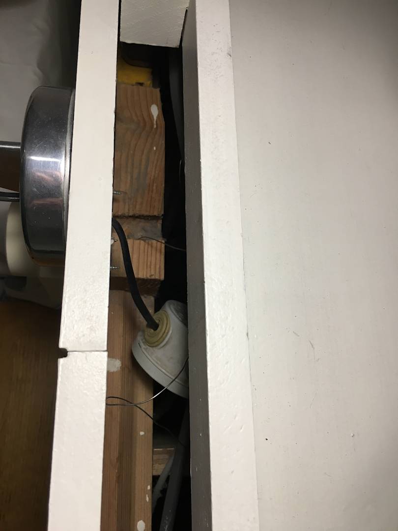Blick hinter die Heizkörperverkleidung. Die ist jederzeit so oben offen einsehbar direkt am Kopfteil des Betts. Staub und Dreck, Kabel, Schrauben, ...