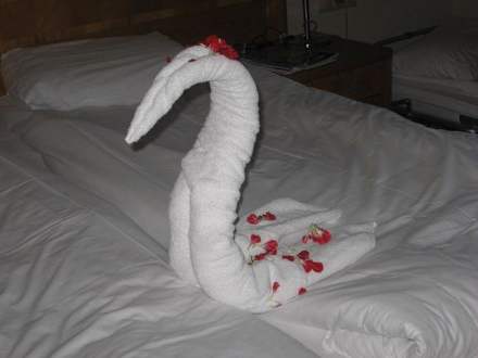 °opgemaakt bed°een zeer groot compliment en respect naar de interierverzorgsters in het hotel. Zij deden elke dag hun uiterste best om de kamers schoon te houden. Als extraatje dus deze mooie zwaan op ons bed. Zo hadden we elke dag wel een andere verrassing.