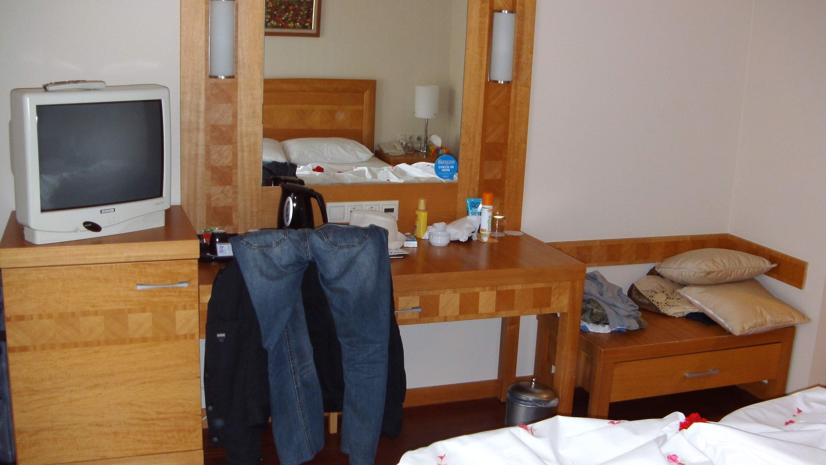 Kühlschrank, TV und großer Spiegel