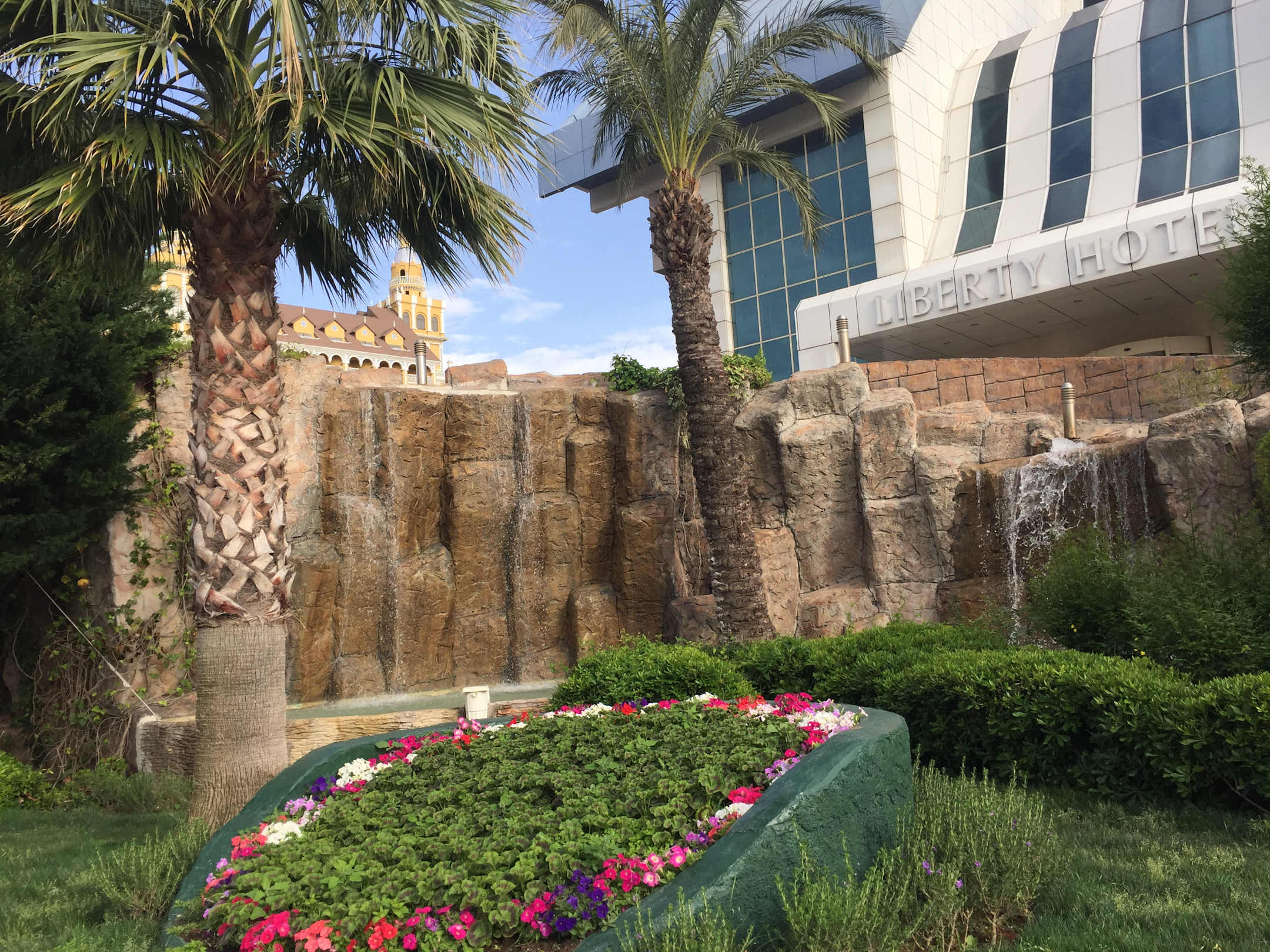 künstlicher Wasserfall vor dem Hotel