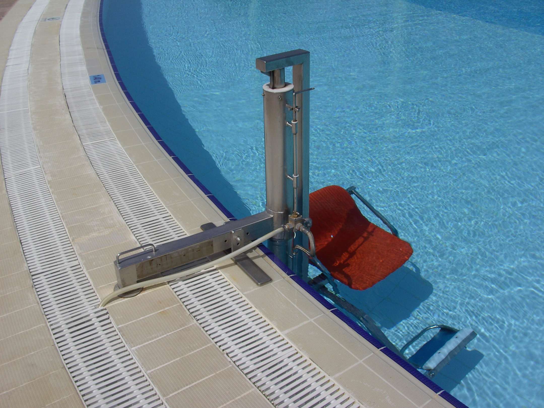 Da kommen Personen die schlecht zu Fuß sind, mit einer Hilfe ins Wasser!