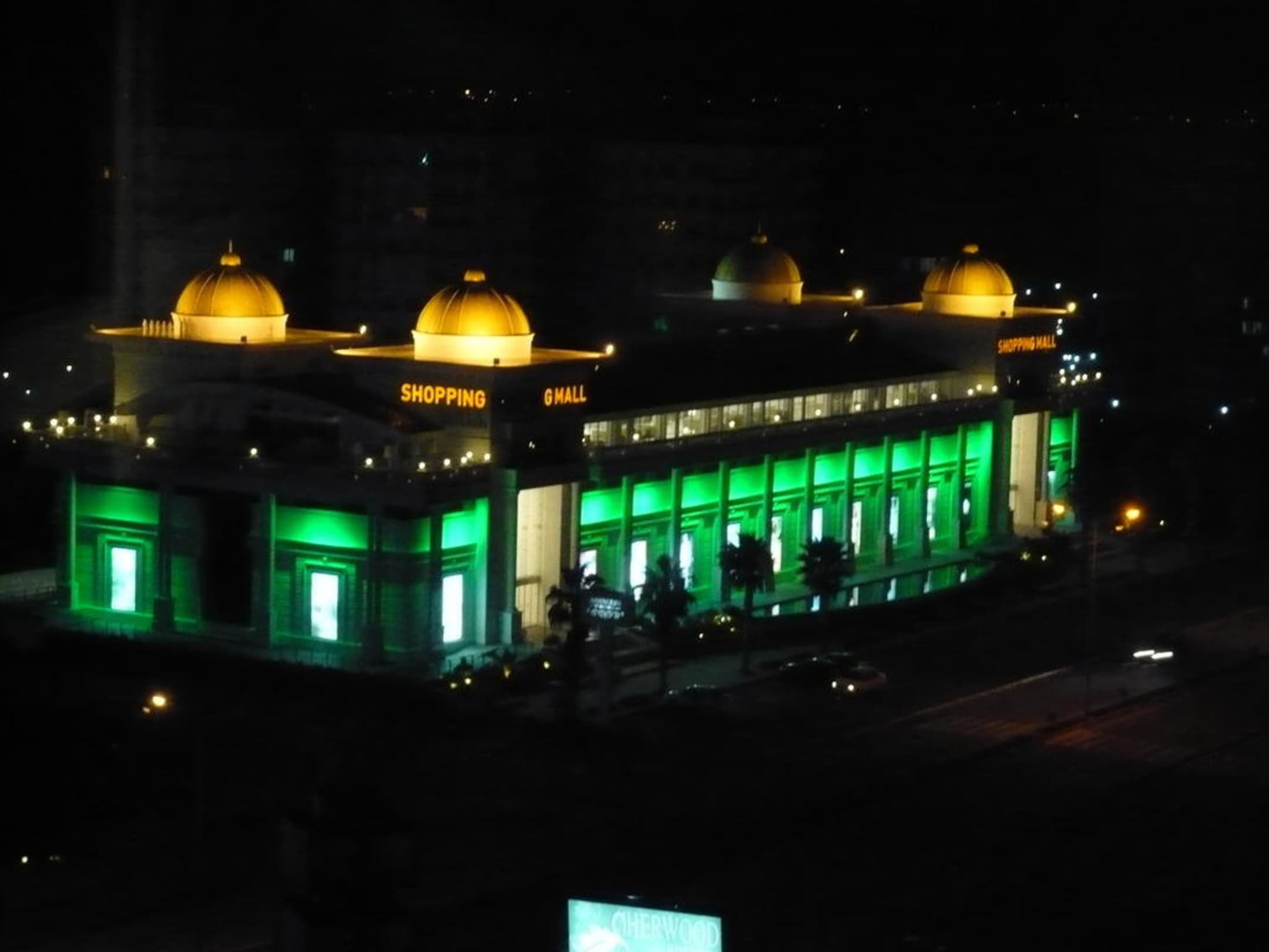.... auf die Nachts beleuchtete Shopping-Mall