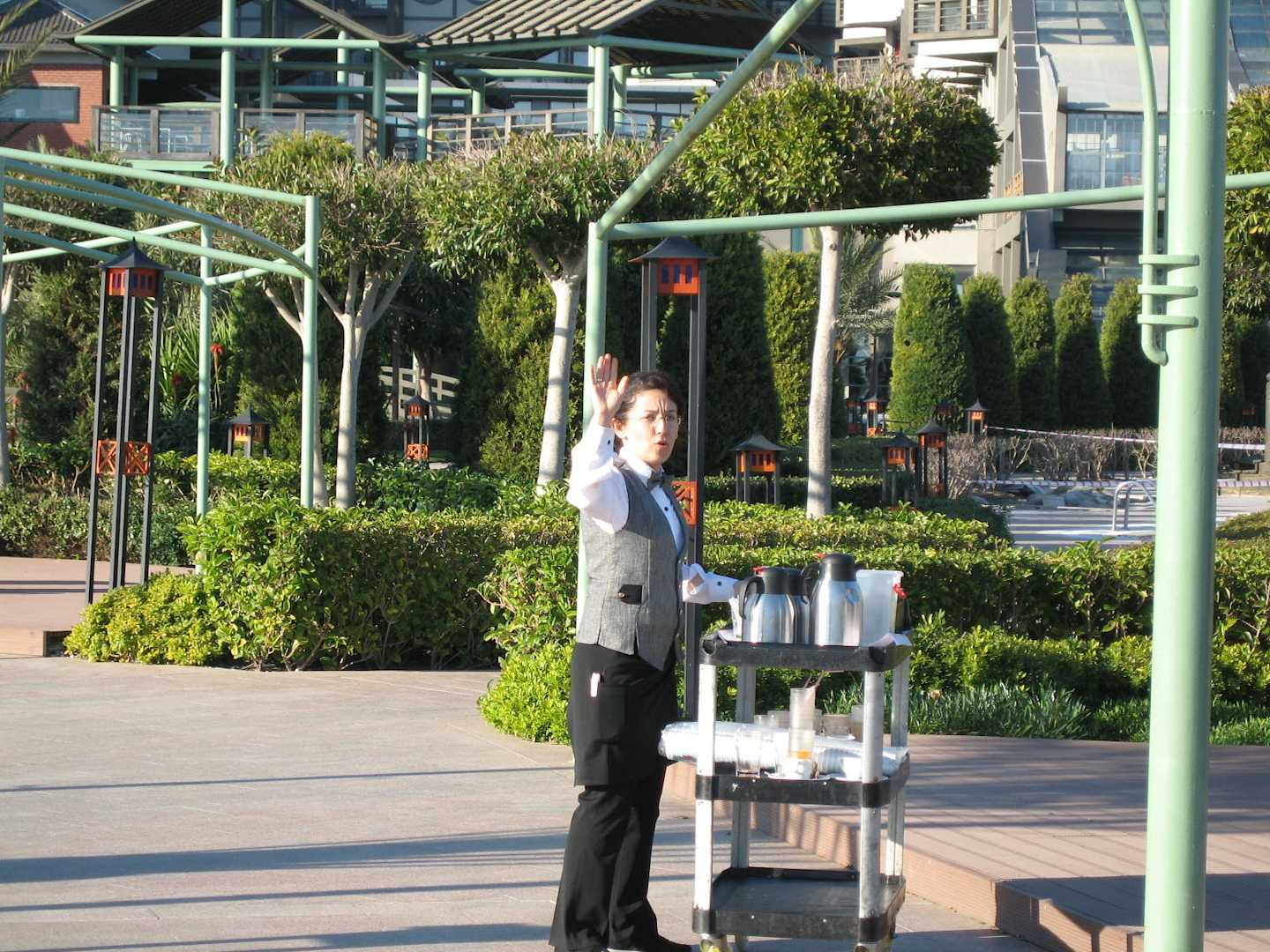Liebe Kellnerin am Pool mit Kaffee und Tee Wagen