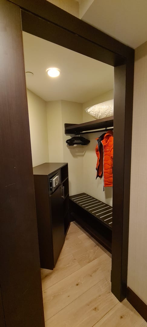 ZimmerGarderobe mit kleinem Schrank, wo der Safe mit integriert ist, allerdings ist die Tür falsch montiert, hätte re sein müssen