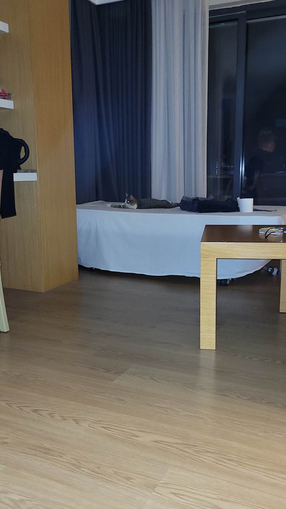 Katze macht es sich im Bett gemütlich weil man kurz auf Toilette gegangen ist