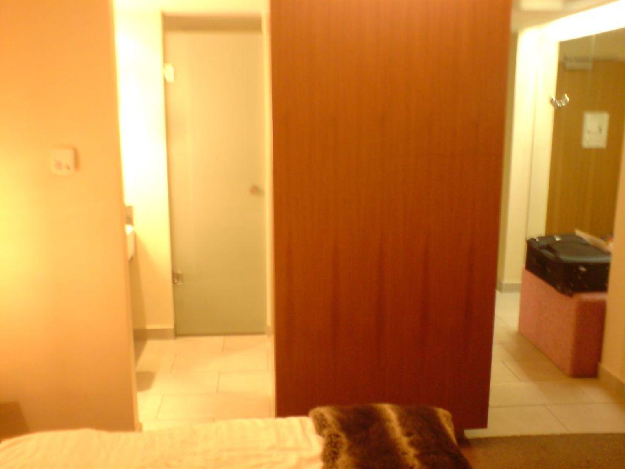 Blickrtg. vom Bett aus, rechts der Flur zur Eingangstür des Zimmers, geradeaus die Milchglastür der Toilette. Hinter dem braunen Schrank war die Dusche, links neben der Milchglastür das Waschbecken. Wem es gefällt...